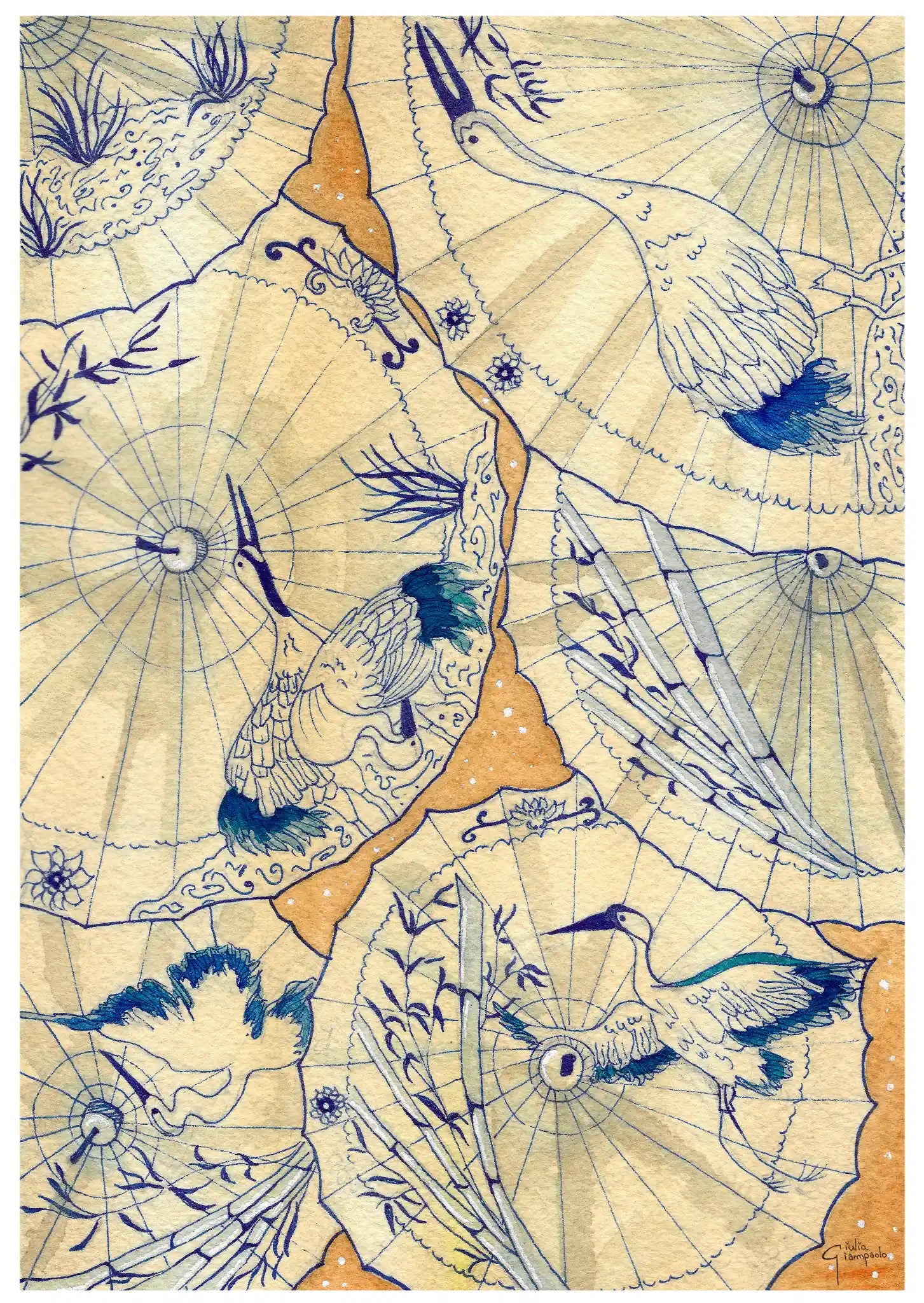 A delicate rain of color, this watercolor shows a swirl of Japanese umbrellas floating gently through the sky. Inspired by traditional patterns and soft hues, it captures the quiet poetry of a rainy day in Japan.