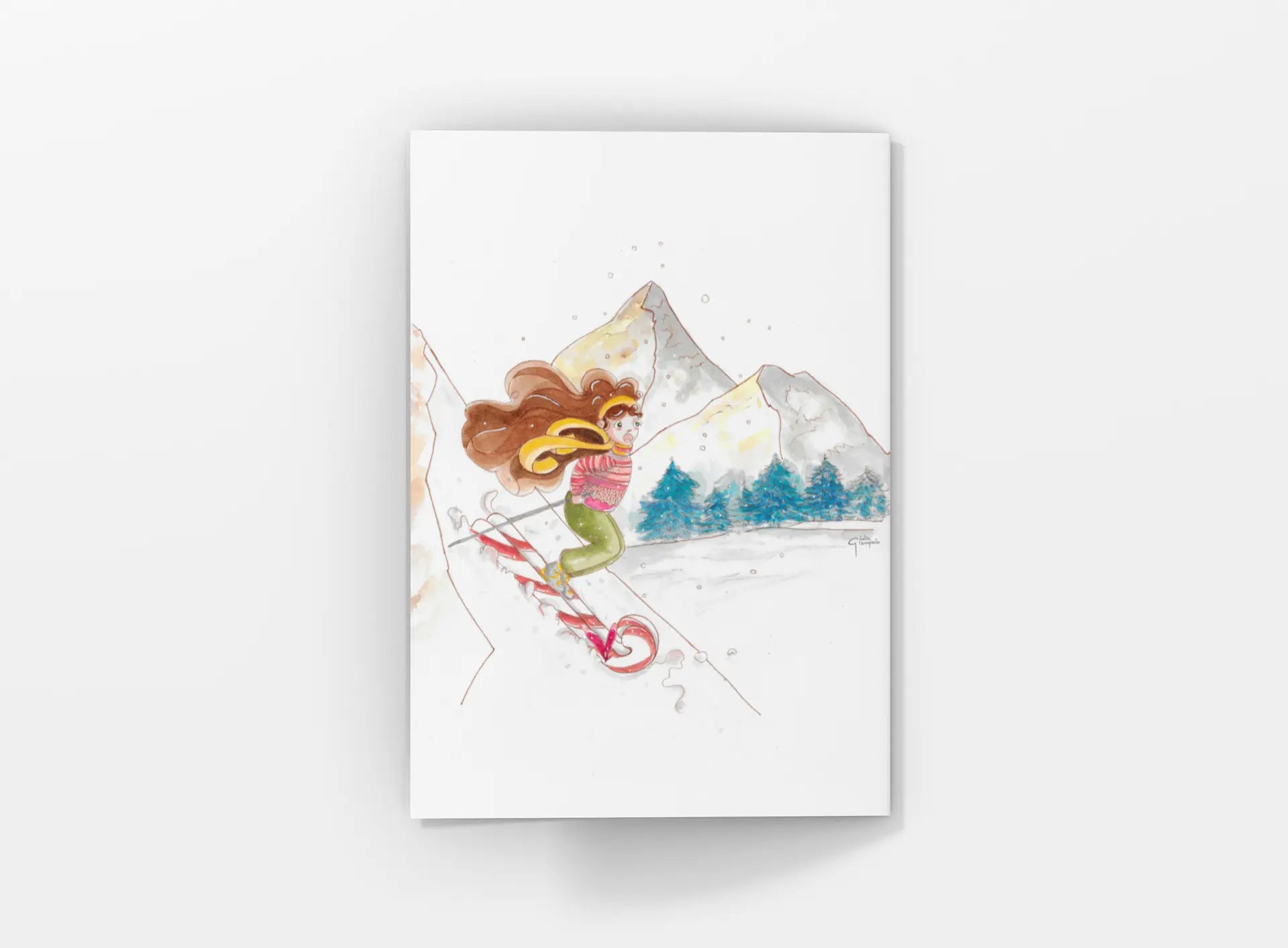 A lively watercolor illustration of a girl skiing down snowy mountains — with candy canes as her skis. Playful and full of movement, this card captures the fun of winter adventures and the sweet joy of the season. Perfect for holiday wishes or to brighten any winter day.